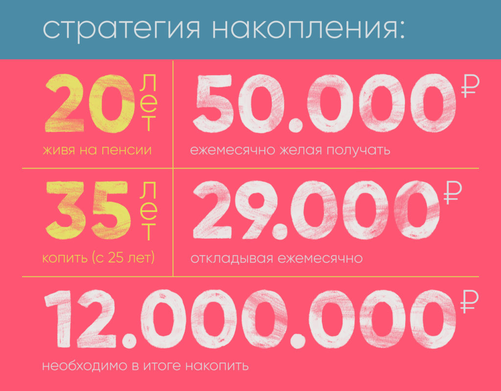 Сколько тогда нужно откладывать в месяц? Например, вам 25 и в 60 вы хотите на пенсию, то нужно откладывать по 29 тысяч рублей, чтобы накопить 12 миллионов в текущих ценах.